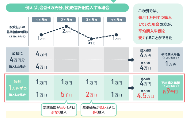 ドルコスト平均法は一定額を定期的に投資する方法で、購入タイミングを分散することができ、価格変動をあまり気にする必要がありません。投資金額を一定にすることで、価格が低いときには購入量が多く、価格が高いときには購入量が少なくなります。